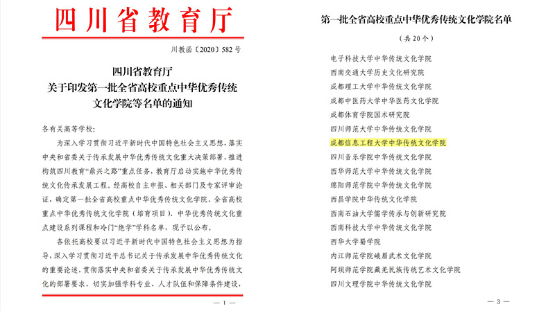 【本网讯】日前,四川省教育厅发布《四川省教育厅关于印发第一批全省高校重点中华优秀传统文化学院等名单的通知》,由我校文化艺术学院牵头,文化艺术学院和研究生处联合申报的“环球官方中华传统文化学院”获批入选“第一批全省高校重点中华优秀传统文化学院”。
