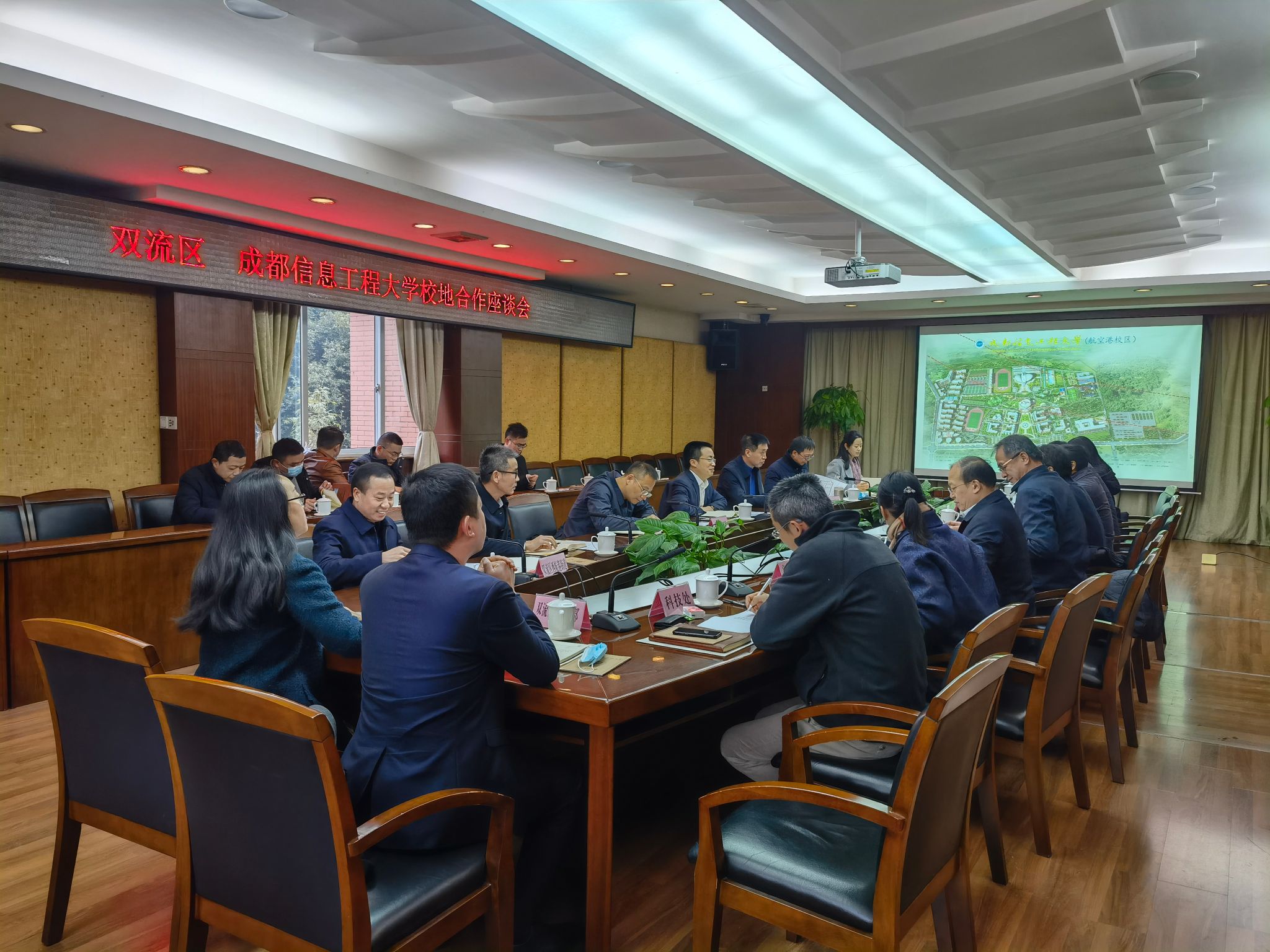 双流区政协主席李德龙、区政府副区长蒋黎旺、区委组织部副部长谢红英、区委宣传部副部长何敏、成都芯谷发展服务局局长谢爽、区规划和自然资源局局长纪昌发、区新科局局长、西航港开发区管委会书记马骏、西航港街道党工委书记沈登军,以及我校相关职能部门负责人等参加了座谈会。