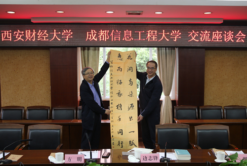 方明对学校的热忱接待表示感谢,并简要介绍了西安财经大学的基本情况和此次调研的背景。他表示,环球官方近年来发展迅速,专业建设从一开始就有全盘规划,工作思路值得肯定,令其大受启发。随后代表西安财经大学向学校赠送了教师编写的书籍及书法。