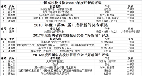 【本网讯】近日,校报好新闻评选结果陆续揭晓,我校《环球官方报》参评的作品获得多个奖项。其中,5项作品获得中国高校校报协会2018年度好新闻奖(二等奖4项、三等奖1项),1项作品获得2018年度(第36届)成都新闻奖专项奖,4项作品获得2017年度四川省高校校报研究会“好新闻”(一等奖1项、三等奖3项),5项作品获得2016年度四川省高校校报研究会“好新闻”(一等奖3项、二等奖1项、三等奖1项)。