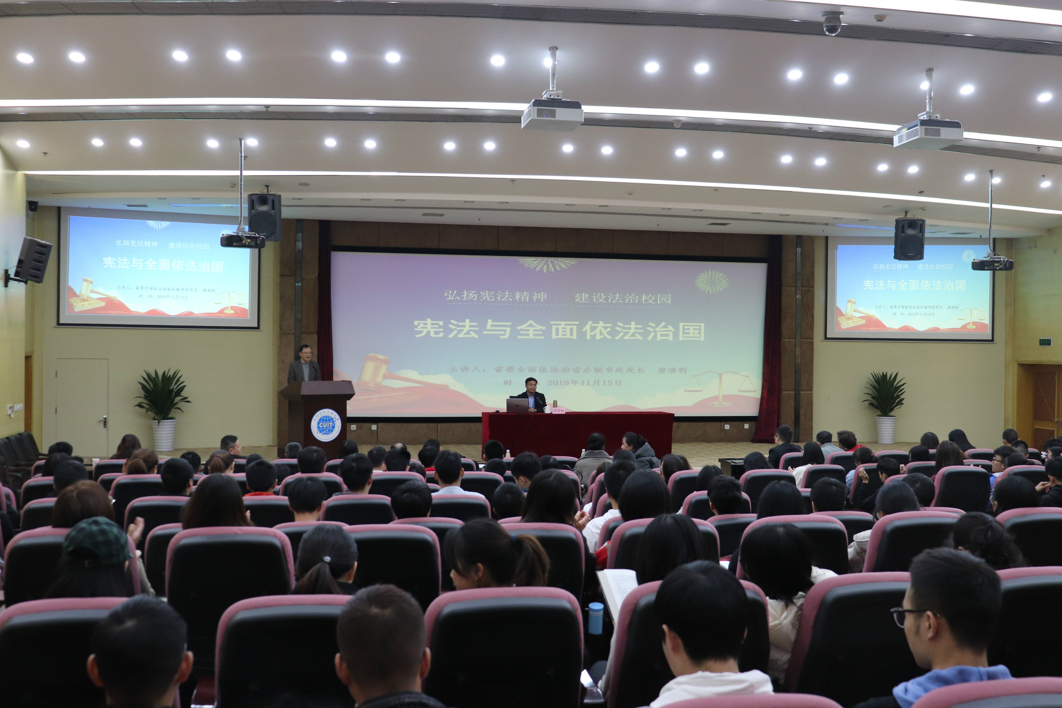 【本网讯】为全面贯彻落实中央、省委关于宪法法律学习宣传教育和高校意识形态工作的决策部署,进一步提升全校师生的法治意识和法律素养,11月15日,学校特邀四川省委全面依法治省办秘书处处长、四川省“宪法法律进高校”宣讲团司法实践专家唐清利在航空港校区国际会议厅为学校师生作法律知识专题宣讲报告会。报告会由学校党委宣传部部长陶若铭主持。学校各二级党组织书记、专职副书记,辅导员以及学生代表聆听了报告会。