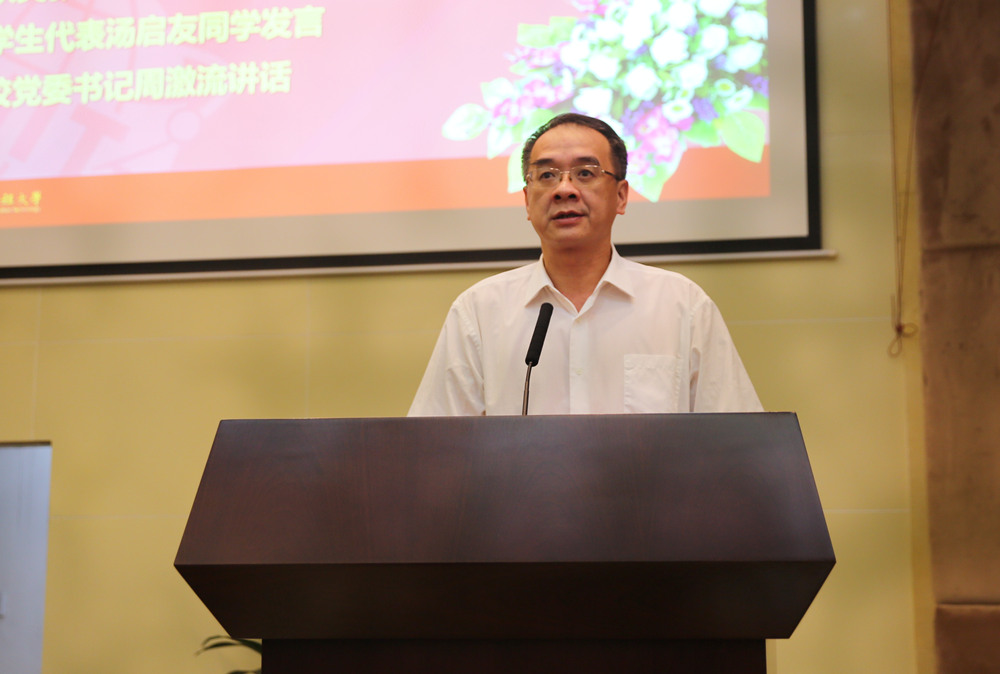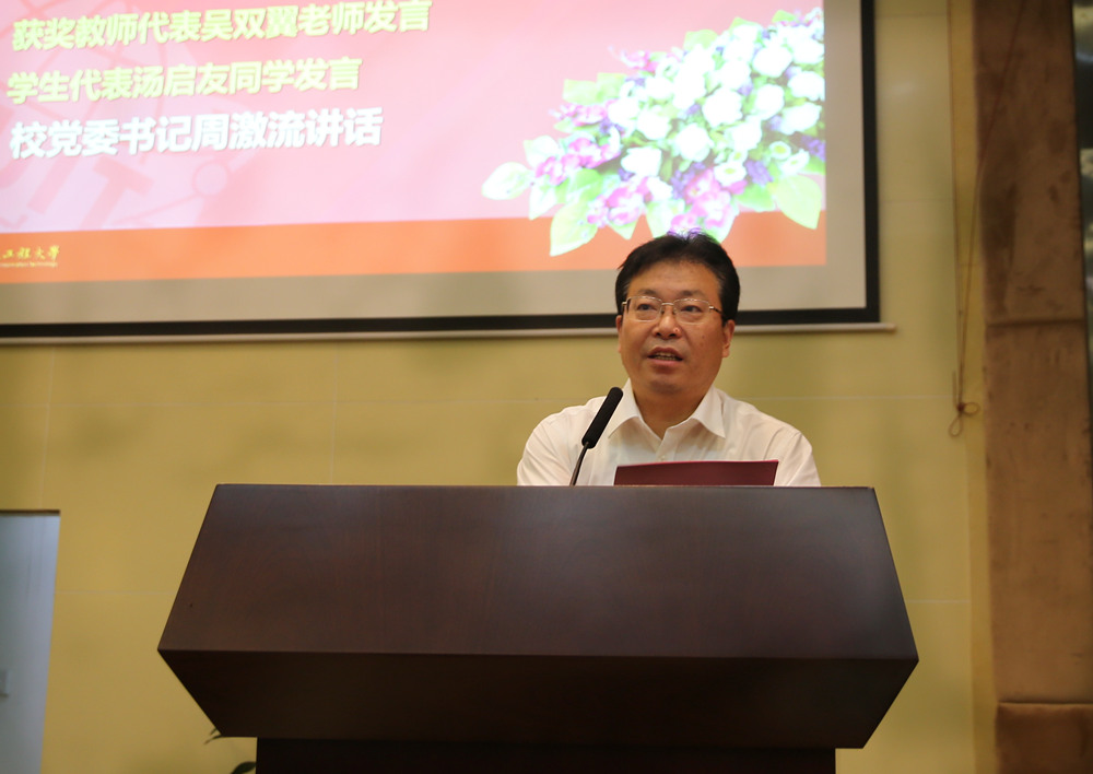 周激流代表学校向长期以来默默耕耘在学校教学、科研以及管理工作第一线的全体教职工致以节日的祝贺和崇高的敬意!向为学校的改革、建设和发展作出重要贡献的老教师、老领导、老同志们致以节日的慰问和衷心的感谢!向受到表彰的先进团队和优秀个人表示热烈的祝贺!