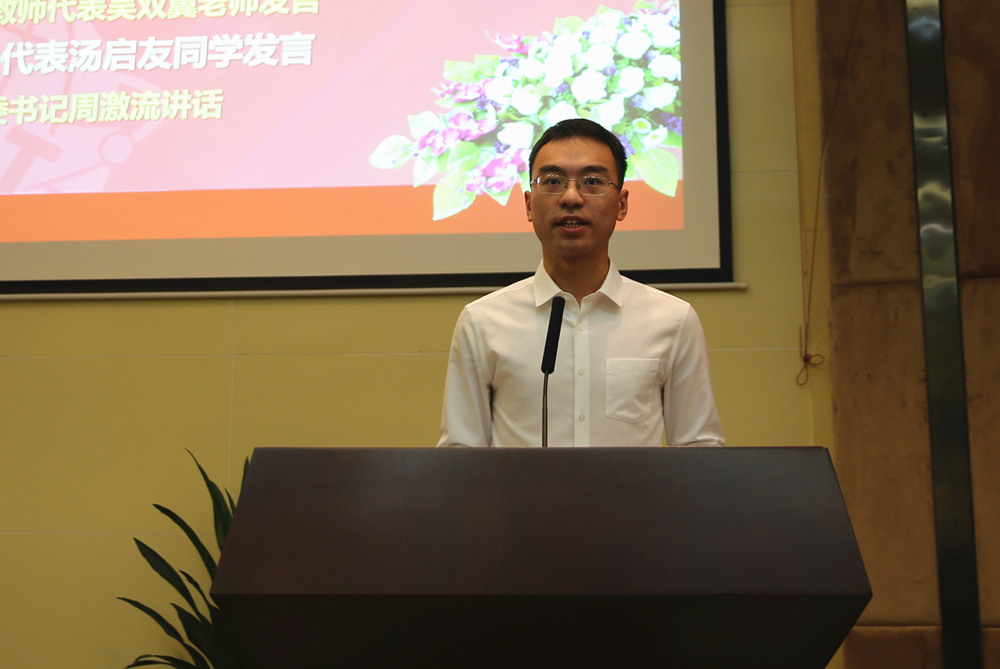 软件工程学院学生汤启友代表全体成信学子全校教职工表达了祝福和敬意。他说,在成信大,老师们讲台上的激昂慷慨,实验室里的循循善诱,校园里的谈笑风生,办公室里的情真意切,影响着身处人生重要时期的同学们,使成信学子学会了做人、做事、做学问。同学们会将深深的感激和敬意化作成长的动力。