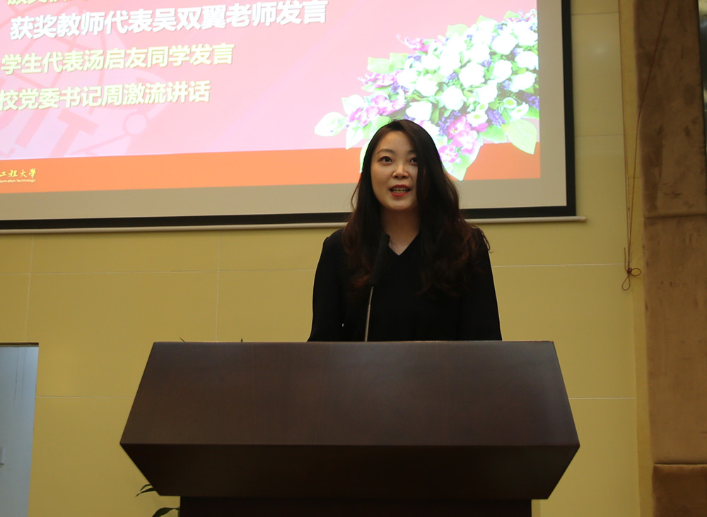 文化艺术学院吴双翼代表获奖教师发言。作为一名一线教师,她体会到教育的核心是“奉献、能力、爱心、高尚”,她说,教育不是灌输,而是点燃火焰;教师需要不惜投入教育情感,转变教育观念,更新教学方式,增加教学艺术性,让更多的学生拥有安身立命的一技之长。坚持用正确的思想引领人,用道德的力量教育人,用高尚的精神塑造人,用良心和智慧去塑造人的心灵。