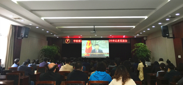 在航空港校区行政楼一会议室、龙泉校区第一教学楼第二会议室,全体校领导、学校职能部门工作人员及师生代表集中观看了新一届中央政治局常委同中外记者见面会的直播。