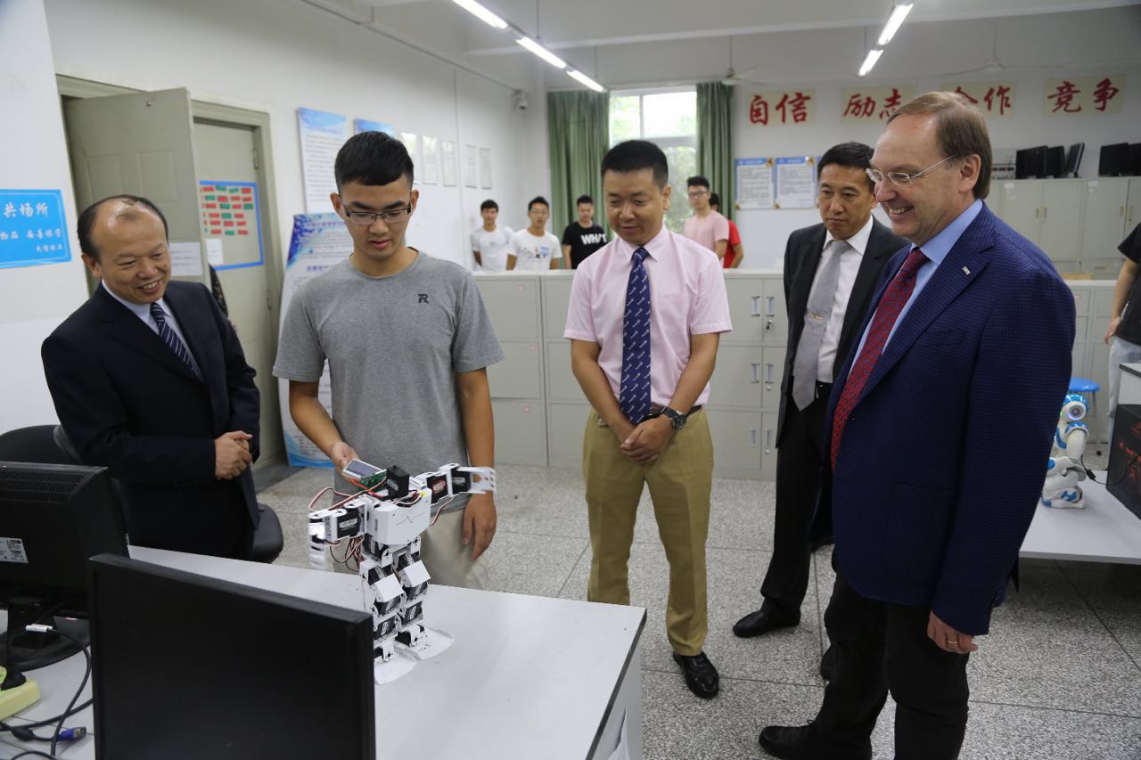 【本网讯】8月26日,德国萨尔兰工程和经济应用技术大学Wolrad Rommel校长一行来校访问,并在行政楼第七会议室参加座谈,商讨合作事宜。学校校长余敏明,副校长何建新,党政办公室、国际交流与合作处、控制工程学院相关负责人等参加了会议。