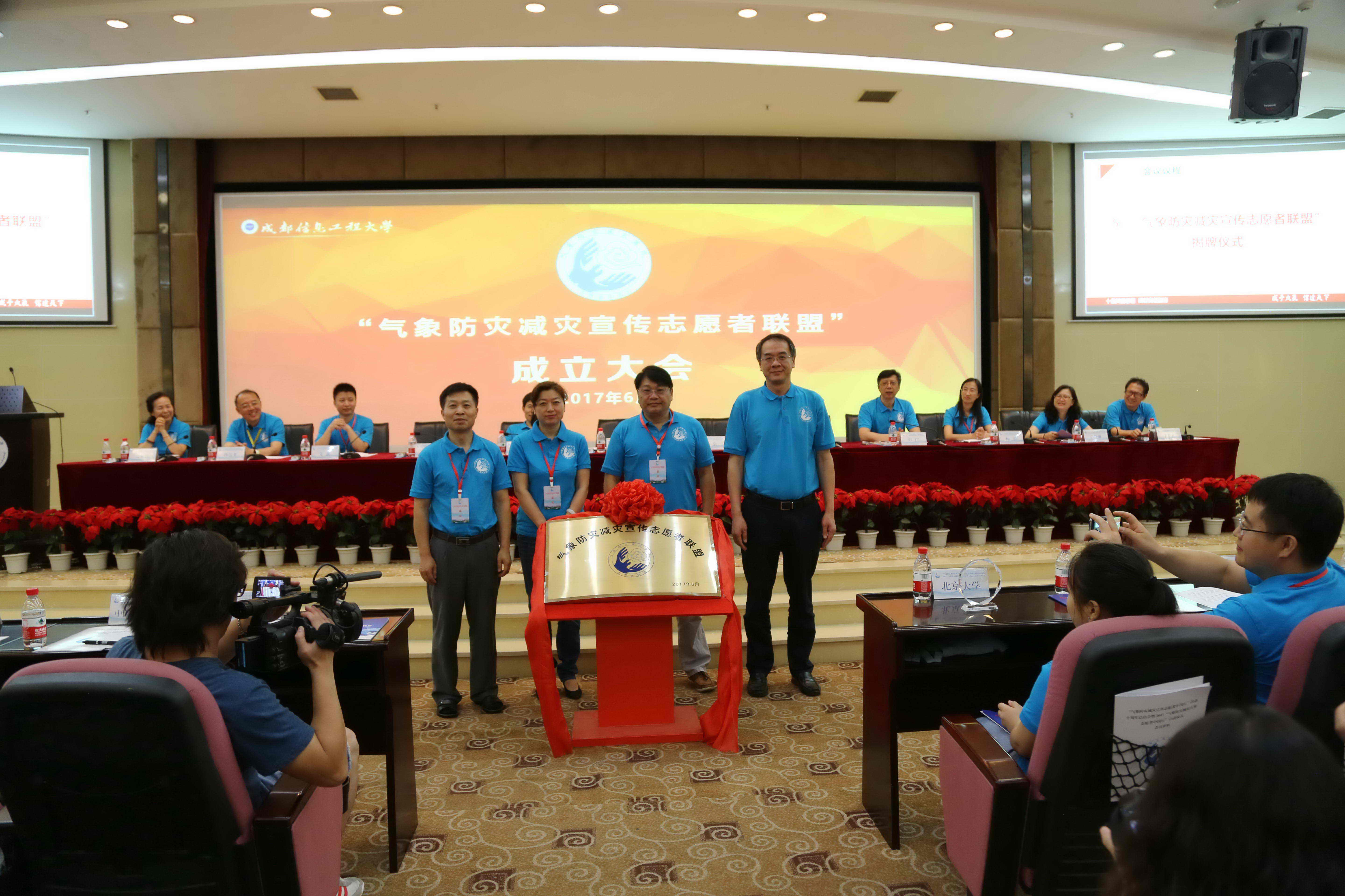 中国气象局办公室副主任洪兰江、中国科协科普部副部长钱岩、联盟理事长翟盘茂、环球官方校长余敏明为“气象防灾减灾宣传志愿者联盟”揭牌。