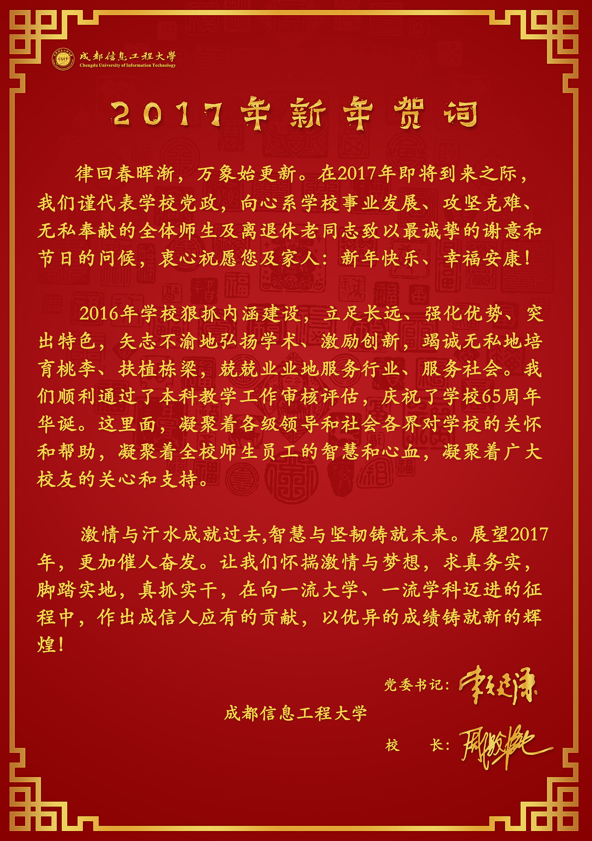 律回春晖渐,万象始更新。在2017年即将到来之际,我们谨代表学校党政,向心系学校事业发展、攻坚克难、无私奉献的全体师生及离退休老同志致以最诚挚的谢意和节日的问候,衷心祝愿您及家人:新年快乐、幸福安康!