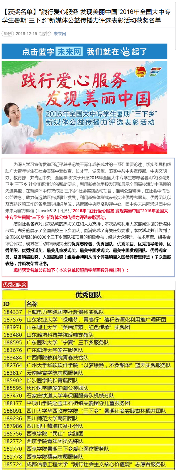 【本网讯】近日,从共青团中央未来网官方微信获悉,在团中央“践行爱心服务 发现美丽中国”2016年全国大中专学生暑期“三下乡”新媒体公益传播力评选表彰活动中,我校“践行社会主义核心价值观”志愿者服务队荣获“全国优秀团队”荣誉称号,成为全国100支优秀团队中的一员,这也是我校社会实践服务队连续第二年获得全国大中专学生“三下乡”社会实践优秀团队荣誉称号。