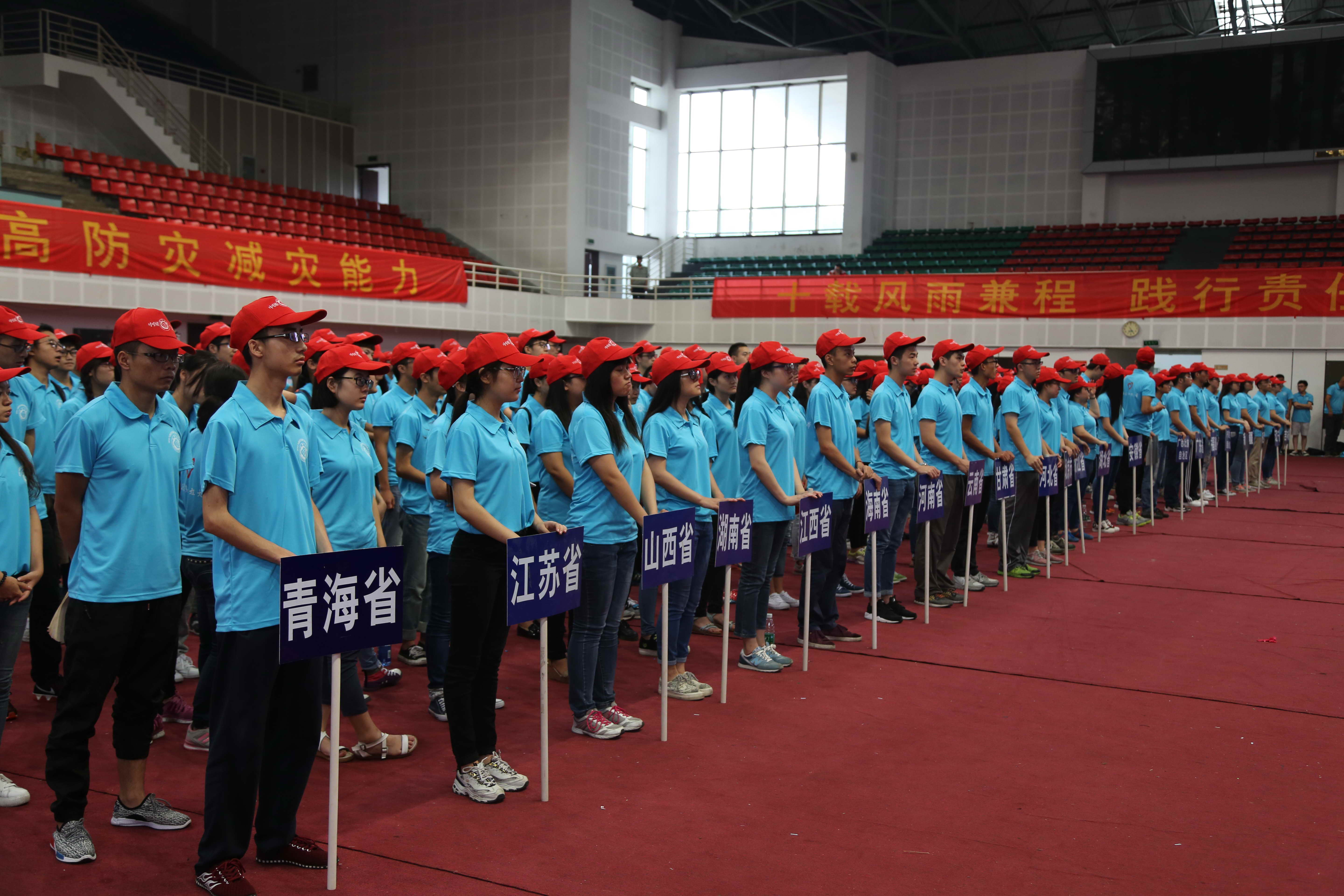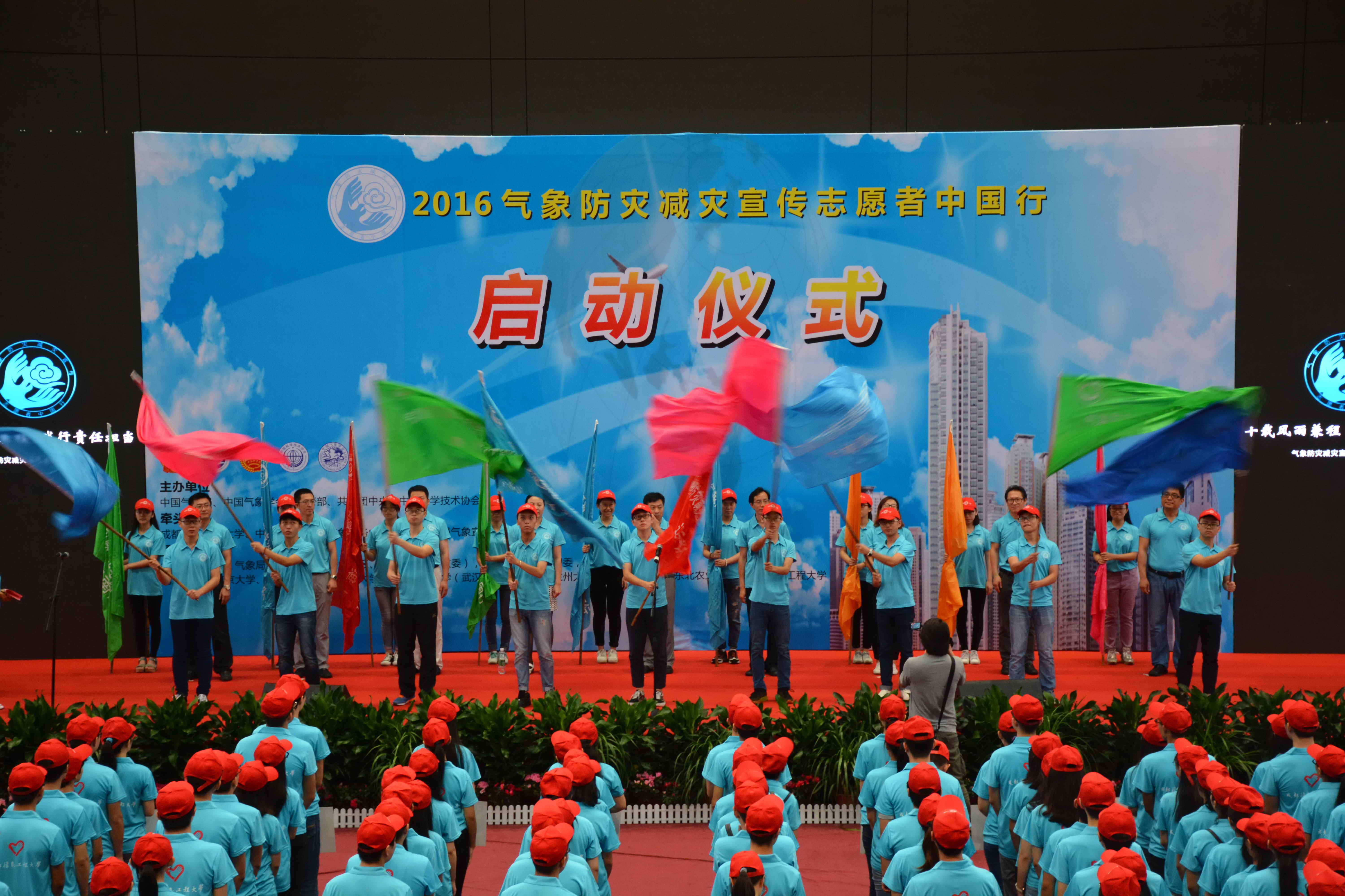 洪兰江宣布“气象防灾减灾宣传志愿者中国行”活动正式启动。启动仪式现场,与会领导向各省志愿者代表授旗,我校大气探测学院学生刘远志代表志愿者领誓。