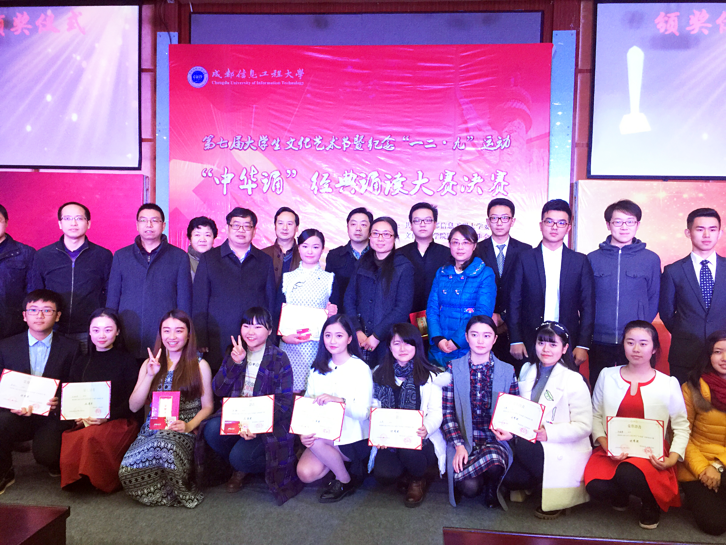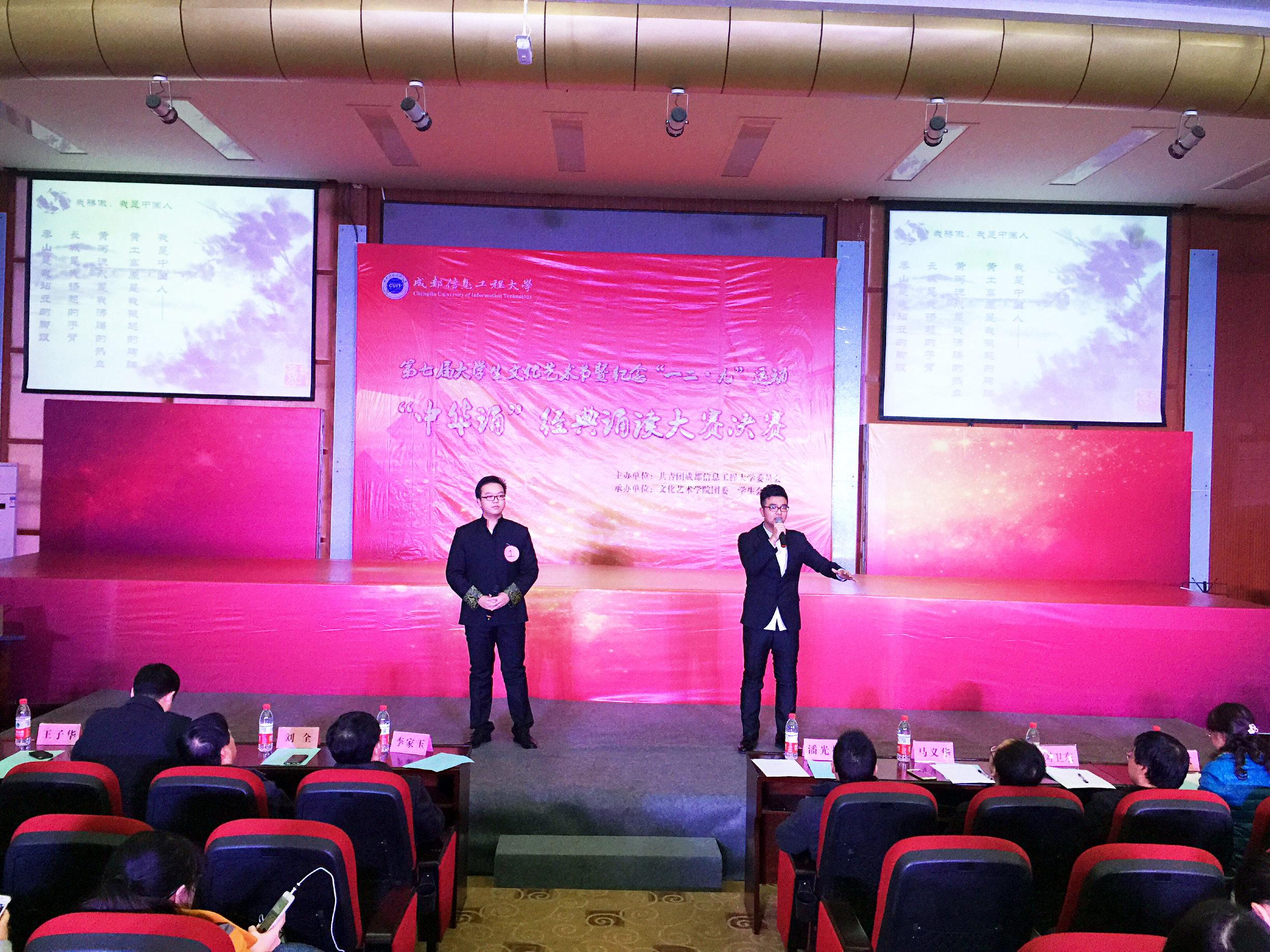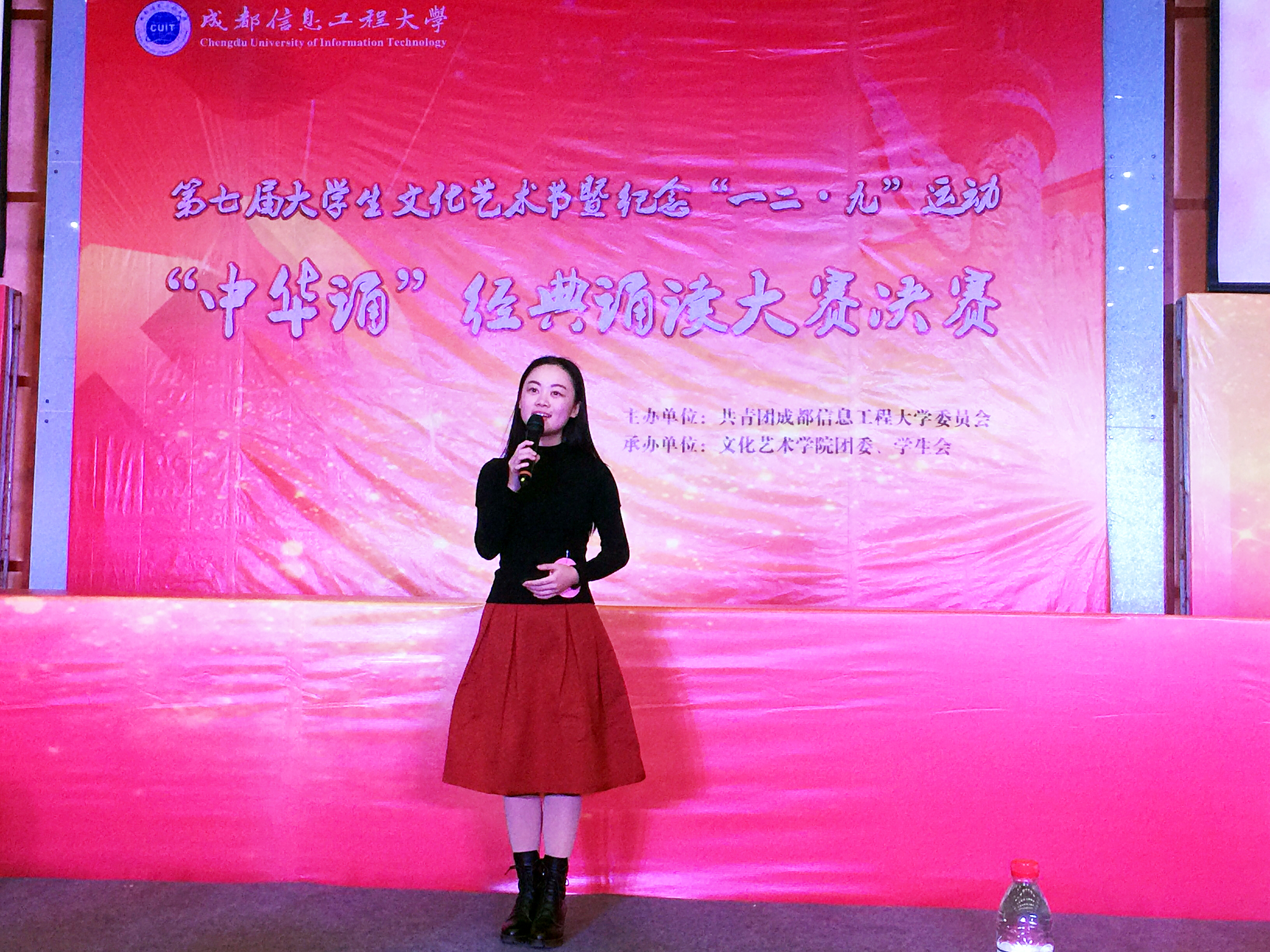 【本网讯】五千年大浪淘沙,多少历史华章沉淀着岁月芳香。吟诗歌,诵中华,筑梦中国。为弘扬爱国主义精神和中华优秀传统文化,进一步浓郁校园文化氛围,提升校园文化品位,激励成信学子在报效祖国的征程中树立民族自信心,奋发有为,12月9日,学校在龙泉校区学术报告厅隆重举行我校第七届大学生文化艺术节暨纪念“一二.九”爱国学生运动80周年之“中华诵”经典诵读大赛决赛。学生工作处、校团委、继续教育学院负责人,龙泉校区各学院党总支书记(副书记)、团委书记出席活动,与学生代表共同感受经典。活动由校团委主办,文化艺术学院团委、学生会承办。