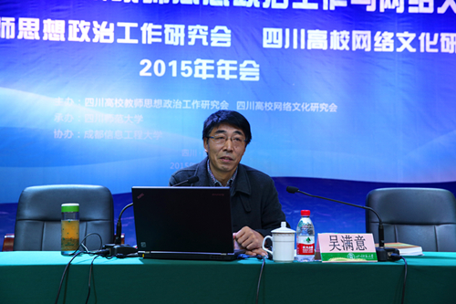 【本网讯】 11月27日,由四川师范大学主办、我校协办的四川高校教师思想政治工作研究会暨四川高校网络文化研究会2015年年会在四川师范大学狮子山校区学术报告厅召开。四川省教育厅宣传思想工作处处长陈小红,四川省社科联规划办主任黄兵,四川师范大学党委副书记唐尚朴,四川高校网络文化研究会会长、我校党委副书记敬枫蓉出席大会。全省86所高校宣传部、相关职能部门的负责人和有关方面的同志共120余人参加会议。我校宣传统战部部长饶华、副部长丁恒康,文化艺术学院教授蓝鹰参会。大会由四川高校教师思想政治工作研究会会长、四川师范大学党委副书记王万民主持。