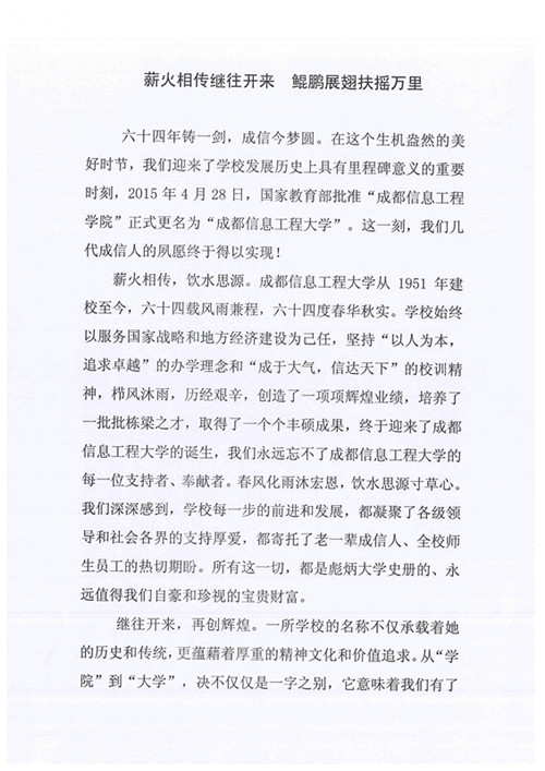 六十四年铸一剑,成信今梦圆。在这个生机盎然的美好时节,我们迎来了学校发展历史上具有里程碑意义的重要时刻,2015年4月28日,国家教育部批准“成都信息工程学院”正式更名为“环球官方”。这一刻,我们几代成信人的夙愿终于得以实现!