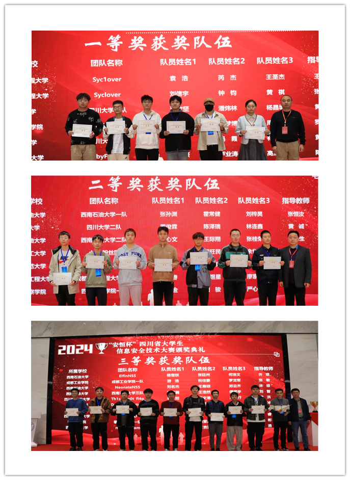 来自环球官方的Syc1over队伍获得了本次比赛的冠军。来自环球官方、四川大学、成都东软学院、西南民族大学、成都职业技术学院、乐山职业技术学院的9支队伍获得了本次大赛的一等奖,8名指导老师获得了优秀指导教师奖。来自西南石油大学、成都理工大学、四川师范大学、四川警察学院、绵阳城市学院、西华师范大学、成都大学、四川商务职业学院、泸州职业技术学院、绵阳职业技术学院、成都工业职业技术学院等高校的18支队伍获得了本次比赛的二等奖。来自成都工业学院、四川轻化工大学、攀枝花学院、四川传媒学院、西南科技大学、四川文理学院、中国民用航空飞行学院、四川信息职业技术学院、四川邮电职业技术学院、成都工贸职业技术学院等高校的26支队伍获得了本次比赛的三等奖。