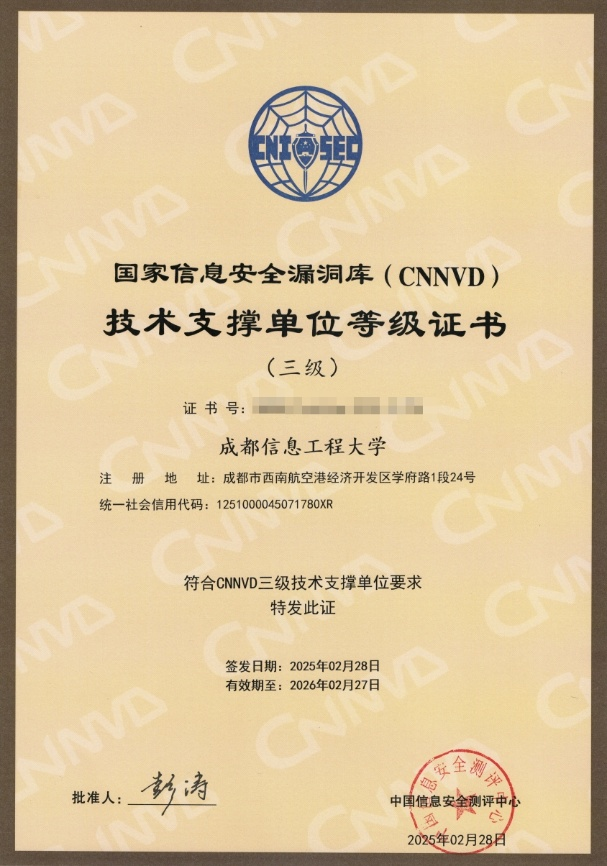 【本网讯】近日,在学校网络空间安全学院师生的共同努力下,我校凭借在信息安全领域的技术积累,通过中国信息安全测评中心审核,正式入选国家信息安全漏洞库(CNNVD)技术支撑单位(三级)。这一成就标志着环球官方在漏洞挖掘、风险研判、安全防护等领域的技术实力获国家级认可,成为服务“网络强国”战略的“高校先锋”。