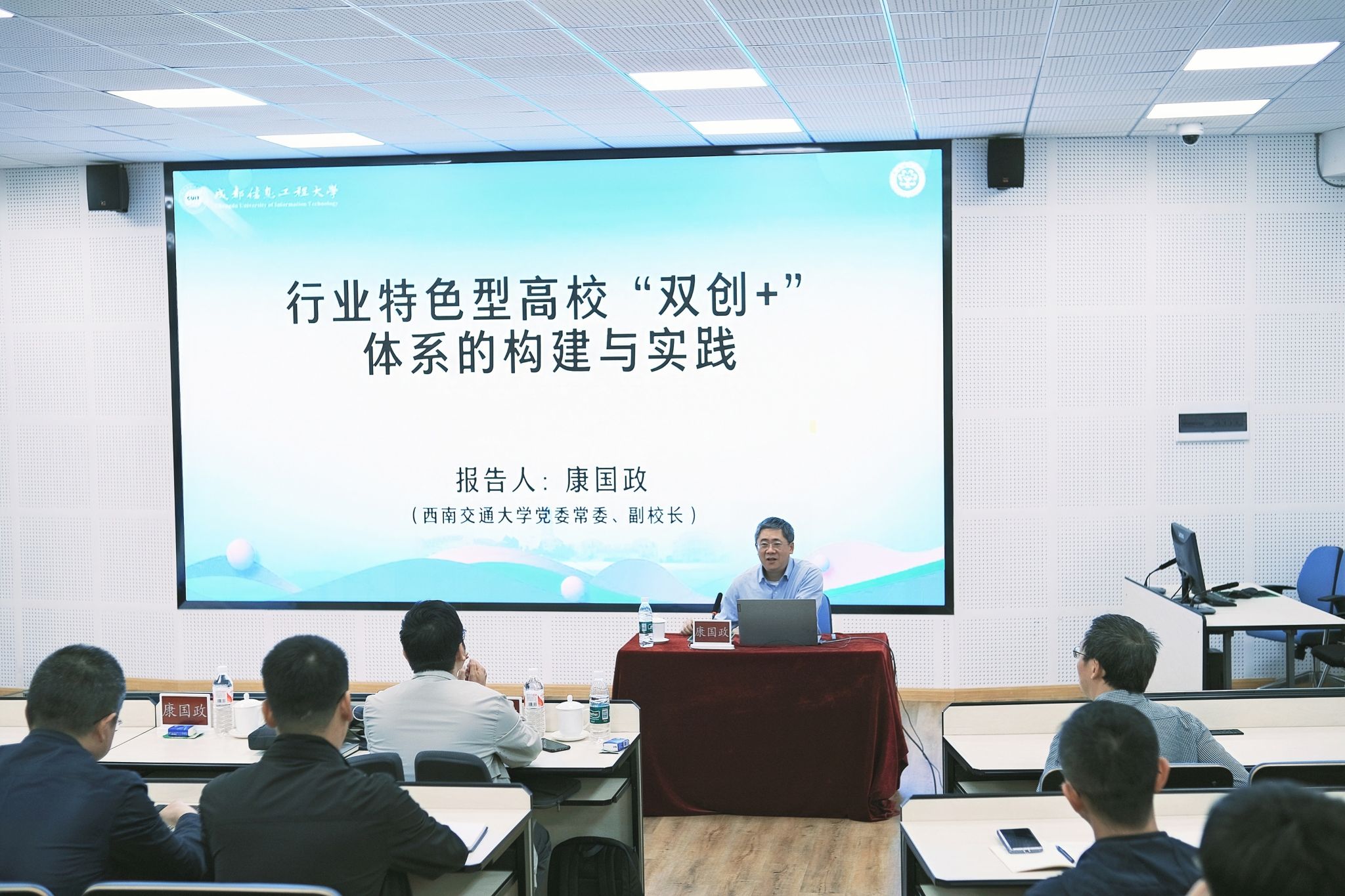 陈权亮在致辞中代表学校向康国政表示衷心感谢。他表示,西南交通大学作为国家首批“双一流”“211工程”“985工程优势学科创新平台”“2011协同创新计划”重点建设高校,在构建助推新质生产力发展的创新创业生态、打造高水平育人基地和创新人才高地等方面有丰富的实践经验值得学习借鉴。他希望参会人员通过本次讲座,学习如何构建系统化的大学生创新创业生态体系,充分发挥我校科技人才集聚地、科技创新策源地和人才培养主阵地的作用,加快培育壮大新质生产力,更好服务于国家重大战略,为推动四川高质量发展贡献力量。