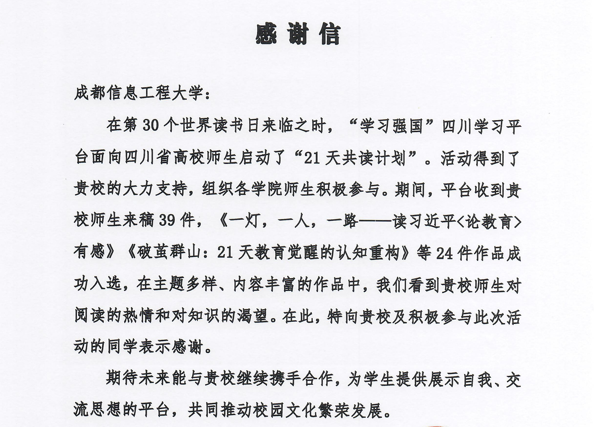 【本网讯】近日,“学习强国”四川学习平台向我校发来感谢信,对我校组织学生积极参与“21天共读计划”表示感谢,对我校积极参与此次活动的学生予以高度赞扬。