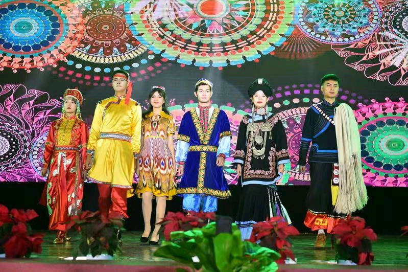 第三篇章《同心筑梦,民族团结谱华章》中,由学生工作处处长龚晓林、计划财务处处长周波、退休教师吴长明和研究生李玉玺带来的诗朗诵《七秩礼赞》将晚会的氛围推向了一个高潮。由各民族同学组成的特殊时装表演队带来的服装秀,校友演唱的歌曲《纳西酒歌》、情景剧《我们都是一家人》都为观众带来美妙的视听享受。晚会尾声,全体演员登场,共同演绎《爱我中华》。