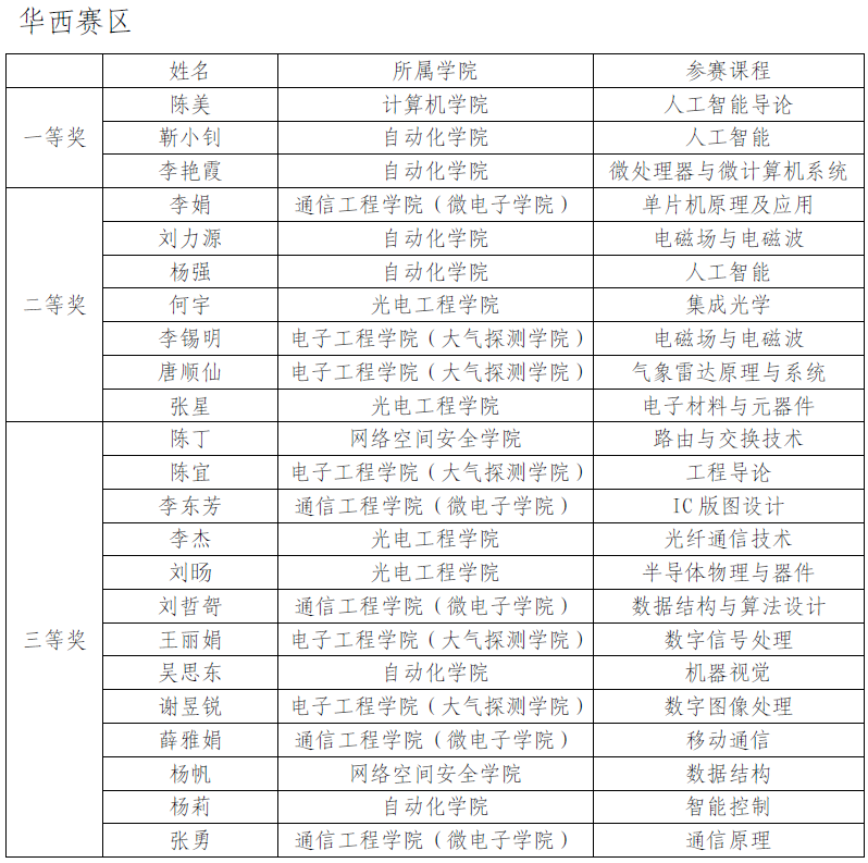 【本网讯】近日,第八届全国高等学校电子信息类专业青年教师授课竞赛预赛顺利结束。经过网络匿名评审,组委会复核审定,比赛结果于8月28日公示。我校青年教师积极参赛提交作品,共23名教师获得省级奖项,一等奖3人、二等奖7人、三等奖13人。计算机学院陈美,自动化学院靳小钊、李艳霞、刘力源、杨强,通信工程学院(微电子学院)李娟晋级全国决赛。