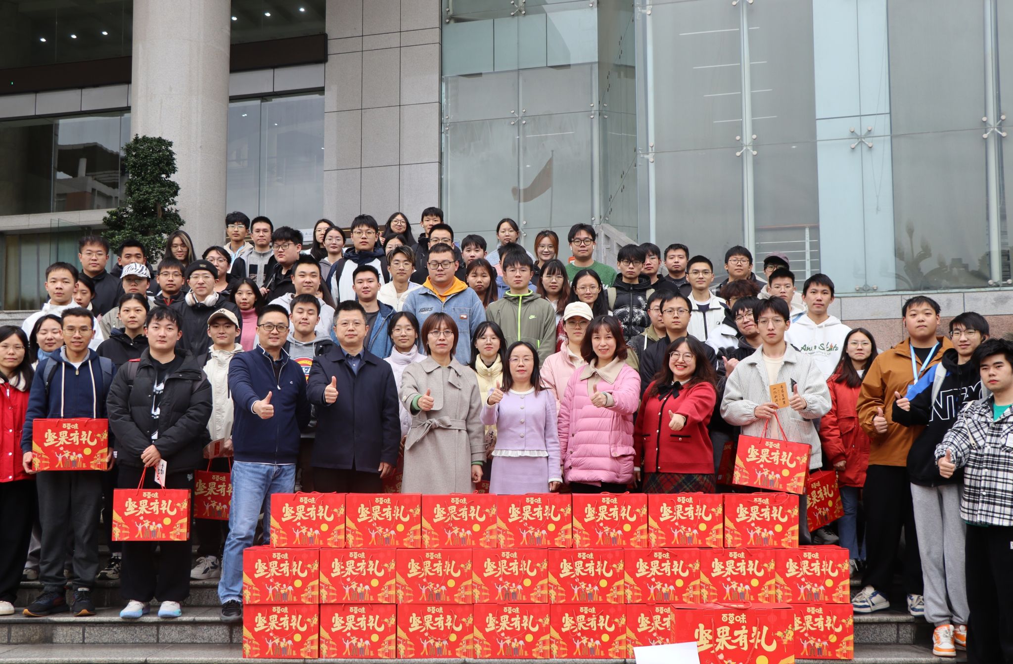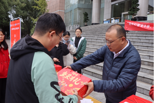 本次送温暖的礼物包含象征“坚定”的坚果礼盒与写满学弟学妹鼓励话语的寄语卡片。希望通过温暖礼物来传递学校、学院对考研学子的关心与鼓励,激励学生们以更饱满的热情和坚定的信心面对即将来临的研究生初试。