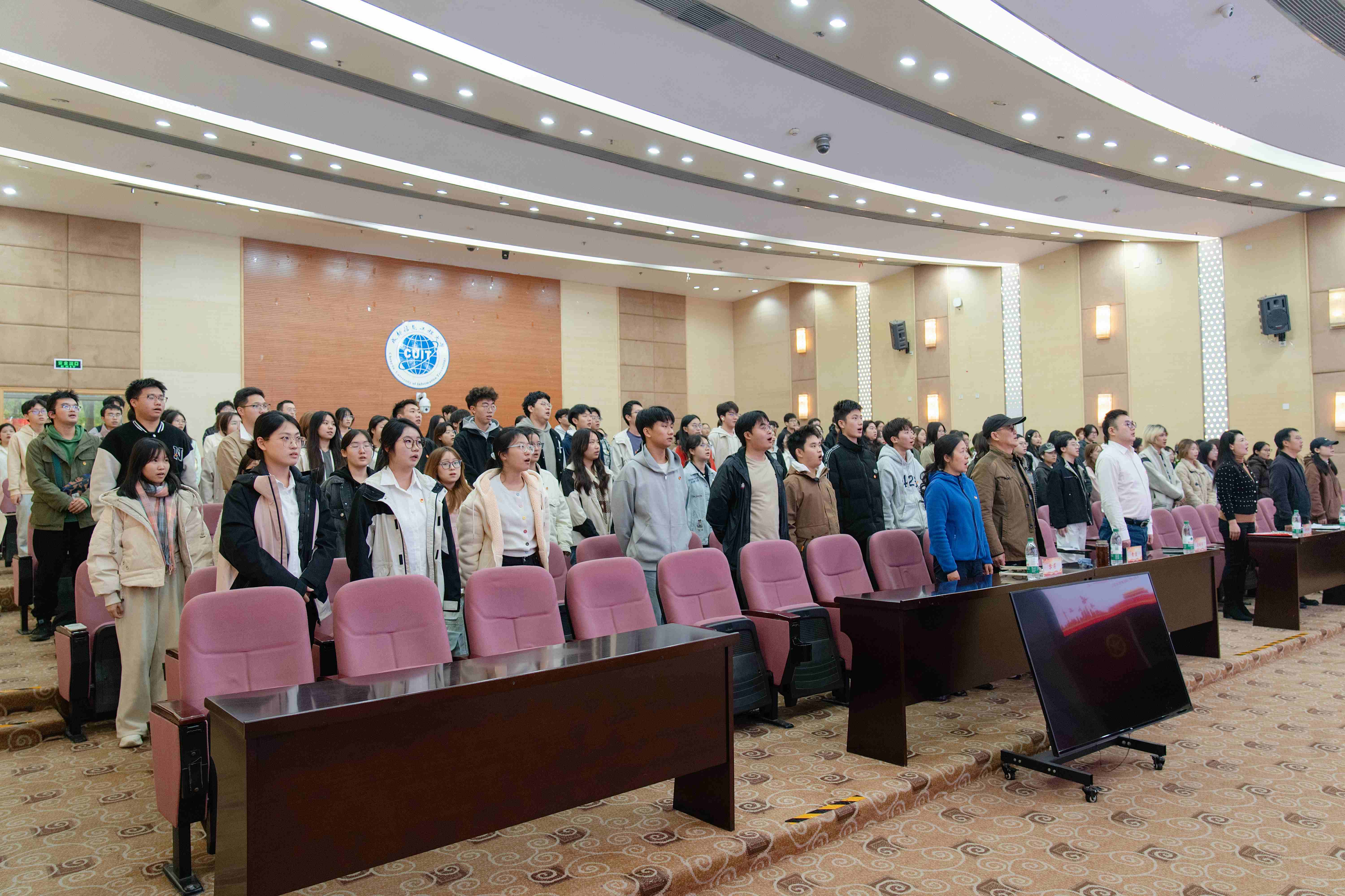 在庄严的氛围中,与会成员全体起立并齐唱团歌。随后进行了“青马班”结业成果视频展示。通过在“青马班”的学习,同学们进一步将所学知识转化为实际行动,将书本上的理论与新征程上奋斗的实践有机结合,树立了立志要为建设中国特色社会主义现代化强国贡献青春力量的崇高理想。