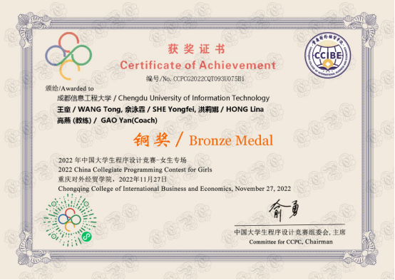 同时,我校的优秀程序设计选手还参加了在重庆和西安举办的国际大学生程序设计大赛,他们在激烈的比拼中脱颖而出,斩获了2项铜奖。我校学子在比赛中取得的优异成绩既展现了他(她)们在计算机领域的才华和实力,也再次延续了成信学子在比赛中的优秀风采,凸显了我校学子在国际舞台上的竞技实力。