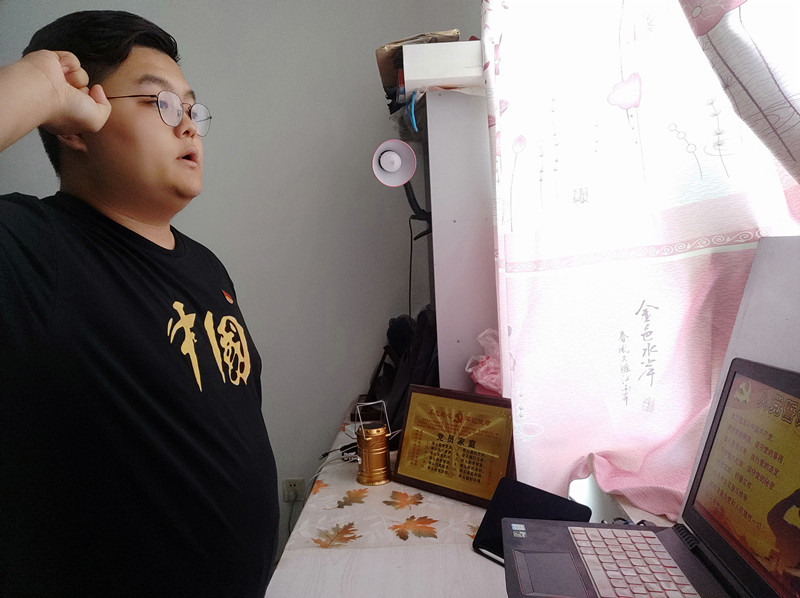 表彰大会后,全体党员在林细俤的带领下,面向屏幕中的党旗,高举右拳,郑重宣誓,重温入党誓词,在党的99岁生日之际,再次向党组织做出庄重承诺后。