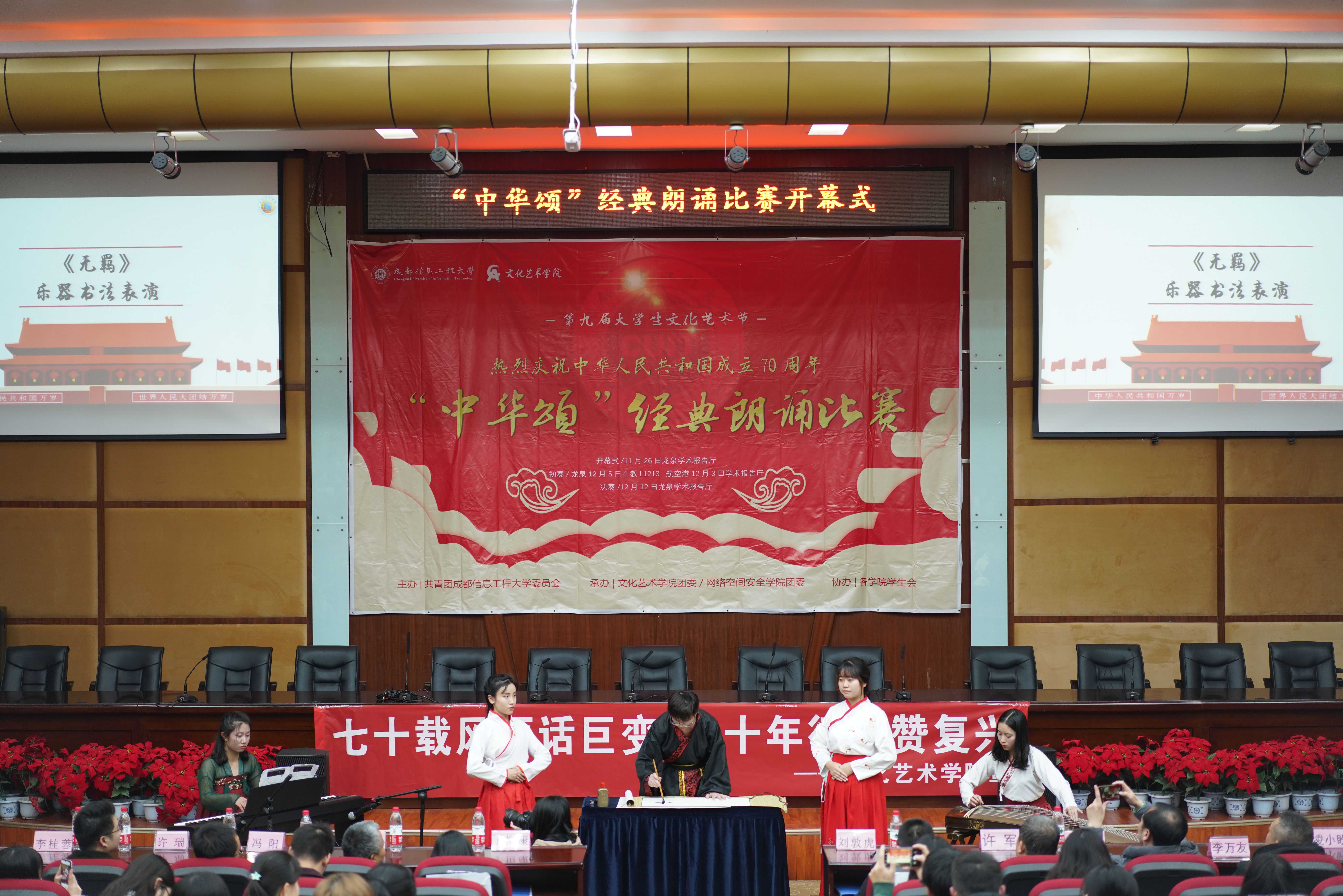 开幕式上,古风才艺表演,婀娜多姿的汉舞表演,委婉动人的古风歌曲,文化气息浓厚的茶艺、乐器和书法表演等节目无不展示了成信学子的特色风采。全场师生挥舞手中的国旗,为祖国的生日而献上赞歌,共同合唱《我和我的祖国》。