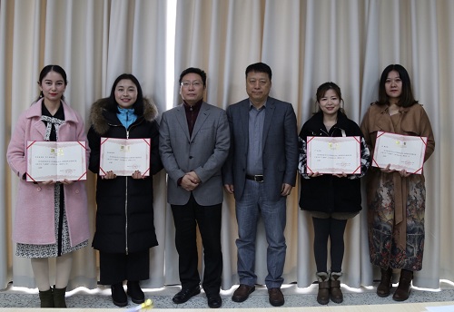 马洪江和李嘉东为工作室揭牌并给工作室主任、学生工作处阿尔祖古丽,工作室副主任大气科学学院辅导员尹欣、电子工程学院辅导员苏露、管理学院学院辅导员余弘丽颁发聘书。