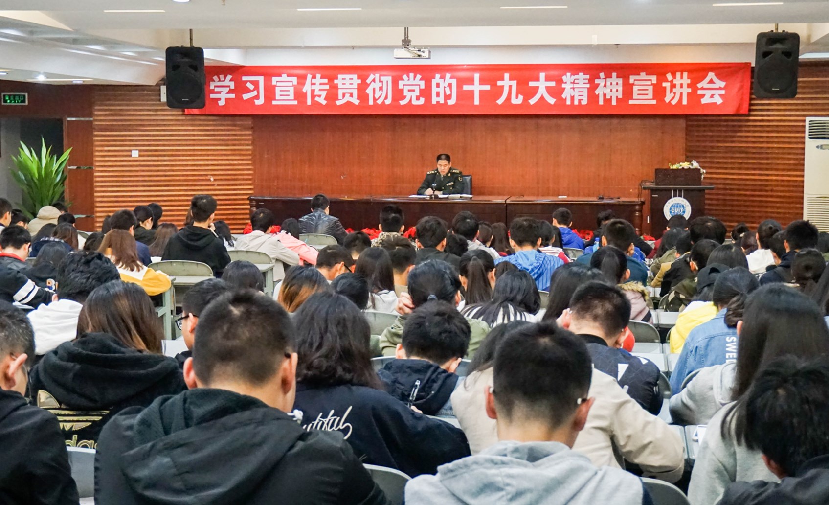 【本网讯】为深入学习宣传贯彻党的十九大精神,在我校学生中迅速兴起学习宣传贯彻十九大精神的热潮,11月15日,学生工作处在我校航空港校区学术报告厅开展了学习宣传贯彻十九大精神宣讲会,学生工作处特邀双流区武装部王政委做主讲人。航空港校区各学院辅导员代表及学生代表300多名参加宣讲会。宣讲会由学生工作处副处长陈智勇主持。