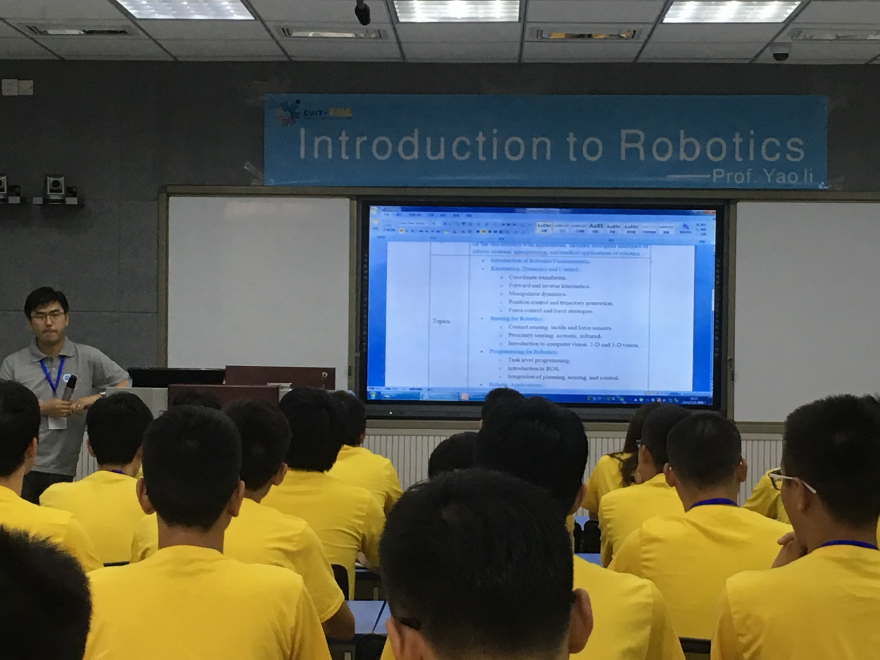 蒋涛教授向同学们介绍了刚从美国留学归来的博士后——李耀老师,并且大致介绍这次授课的主要内容与讨论的话题。随后李耀老师通过风趣幽默的语言为同学们讲述了自己在美国留学的经历与收获,并通过一些耳熟能详的影片——《变形金刚》、《钢铁侠》等引出了今天授课的主题——Introduction TO Robotics,同时向同学们介绍了机器人的各种构造论。同学们专注地记着笔记,全神贯注地聆听,认真思考并通过提问的形式与李老师沟通、讨论,从而获得知识。李耀老师严谨、耐心、认真的授课风格得到了同学们的一致好评。