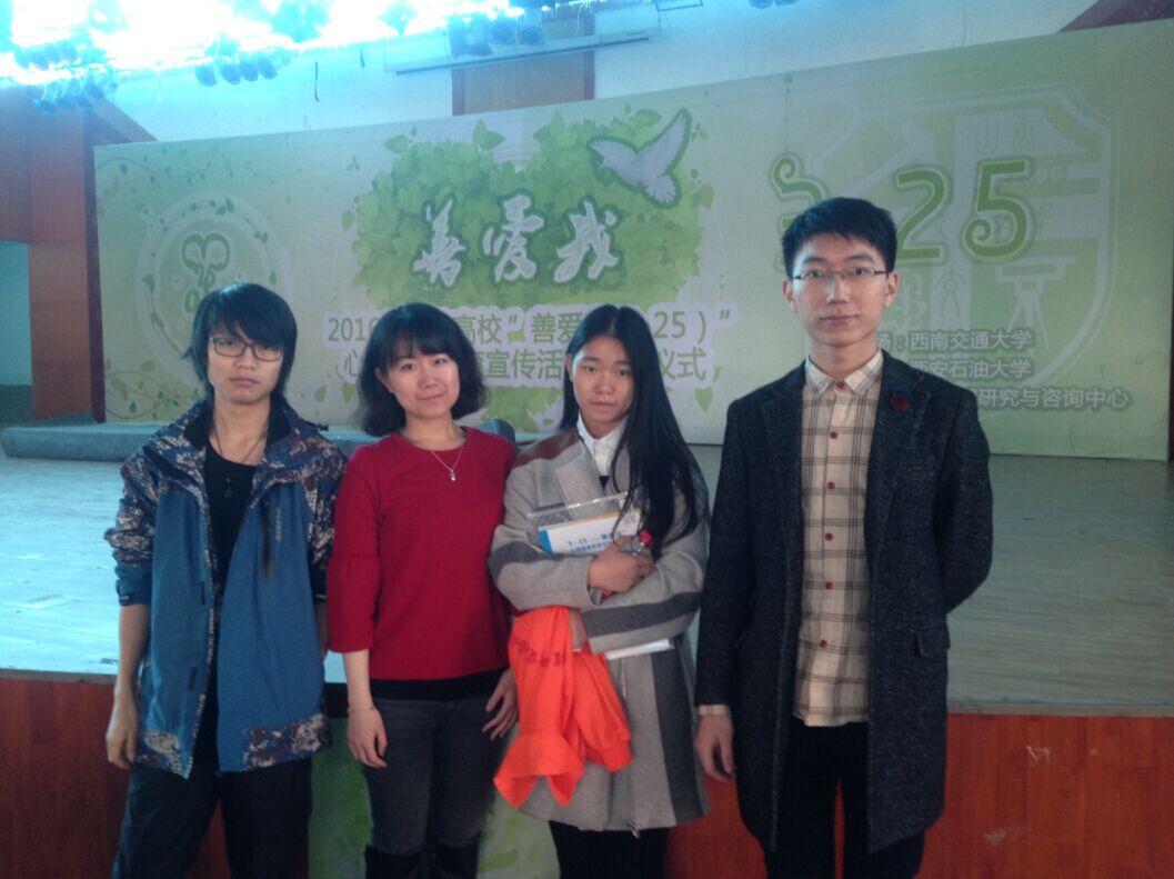 【本网讯】3月25日上午,由西南交通大学主办的“善爱我”(3.25)心理健康教育宣传活动启动仪式在西南交通大学犀浦校区隆重举行,启动仪式上有来自四川及陕西近二十所高校的师生代表,我校心理健康教育中心李嘉雯老师和三名同学参加了本次活动。本次活动的主题是:“善爱我,点亮明天的希望”,旨在以“阳光、坚韧、创造、感恩”为基本目标,促进大学生积极培育“善爱我”的心理文化,使大学生心理健康教育工作水平得到大力提升。