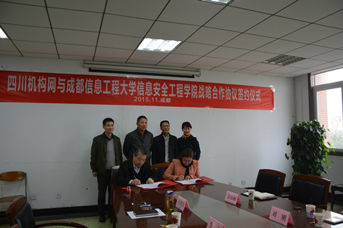 【本网讯】近日,信息安全工程学院与四川机构网战略合作协议签订仪式在我校举行。四川省互联网协会副理事长兼秘书长刘刚、成都绿之蓝科技有限公司总经理苏乾凤、副总苗玮琳以及信息安全工程学院院长李飞、党总支书记许鸿涛等参加了签约仪式。