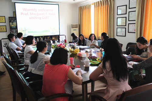 会议由李贵卿主持,她向Margret Reid介绍了管理学院的发展概况、办学特色、学科建设、科研团队等内容。黄萍介绍了我校办学历史,办学理念和特色专业状况,详细介绍了我院现有的旅游规划与旅游信息化、老年社会保障与服务管理、气象灾害预测与预警三个主要研究团队。