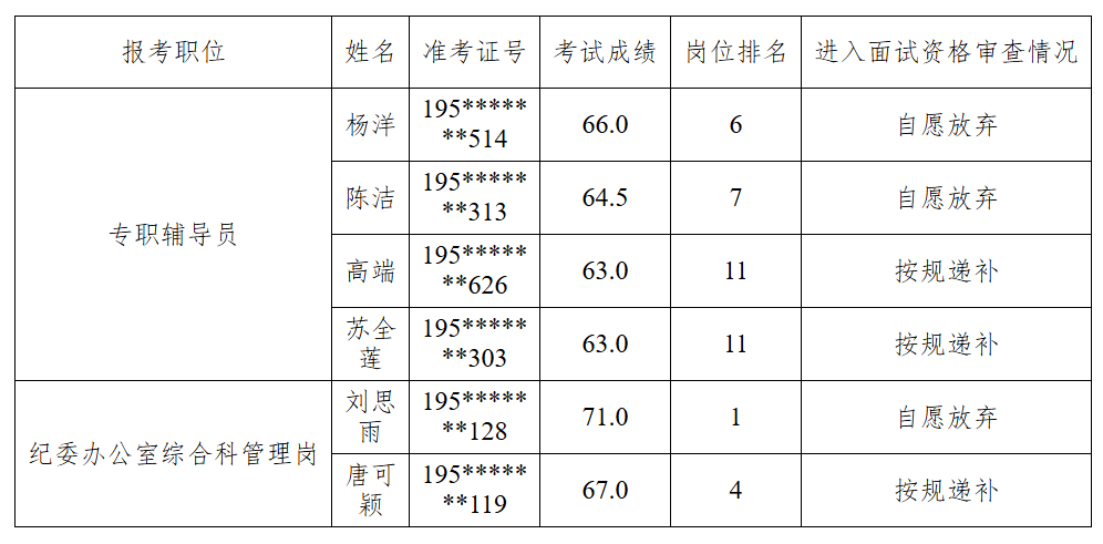 因本次公开选调中,专职辅导员岗2人,纪委办公室综合科管理岗1人,共3人自愿放弃面试资格审查,根据《环球官方关于2025年公开选调工作人员公告》,现递补3名考生进入面试资格审查,具体情况如下: