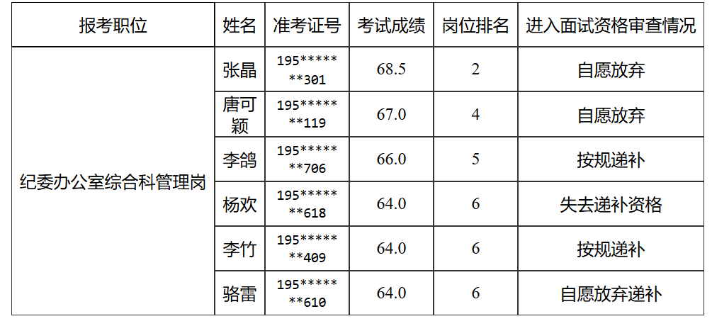 因本次公开选调中,纪委办公室综合科管理岗2人,自愿放弃面试资格审查,根据《环球官方关于2025年公开选调工作人员公告》,现递补2名考生进入面试资格审查,具体情况如下: