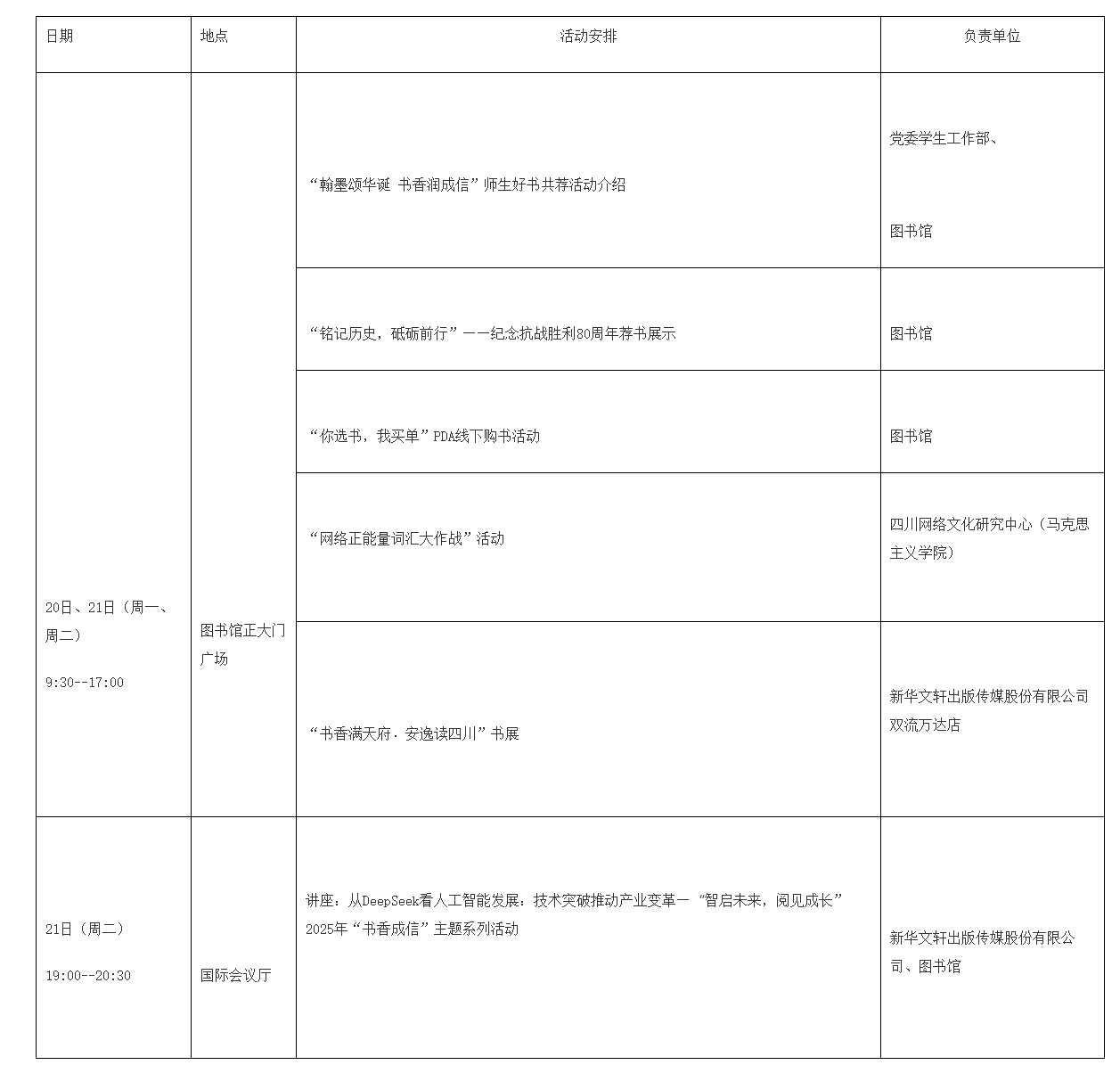 为进一步倡导全民阅读、终身学习的文明风尚,努力建设学习型社会,由四川省委宣传部指导、天府书展组委会主办的“天府书展进校园”活动将于10月20-21日在环球官方举行。学校图书馆在此背景下结合2025年度“书香成信”活动方案,设计了系列活动,期盼师生们在阅读中开阔视野,陶冶情操,提升文化素质。现将活动安排通知如下,欢迎广大师生积极参与!