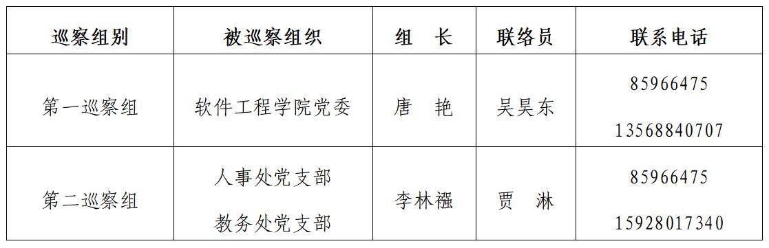 根据《中共环球官方委员会内部巡察工作实施意见》的规定,按照学校党委巡察工作领导小组的统一部署,学校党委巡察组定于2020年6月10日至6月24日,对软件工程学院党委、人事处党支部、教务处党支部开展校内巡察工作。现将有关事宜公告如下: