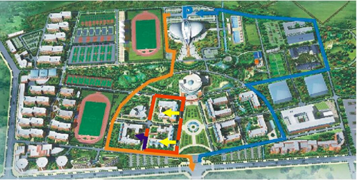 橙色路线为考试结束后车辆出口路线     红色为教学区警戒线,禁止人员进出