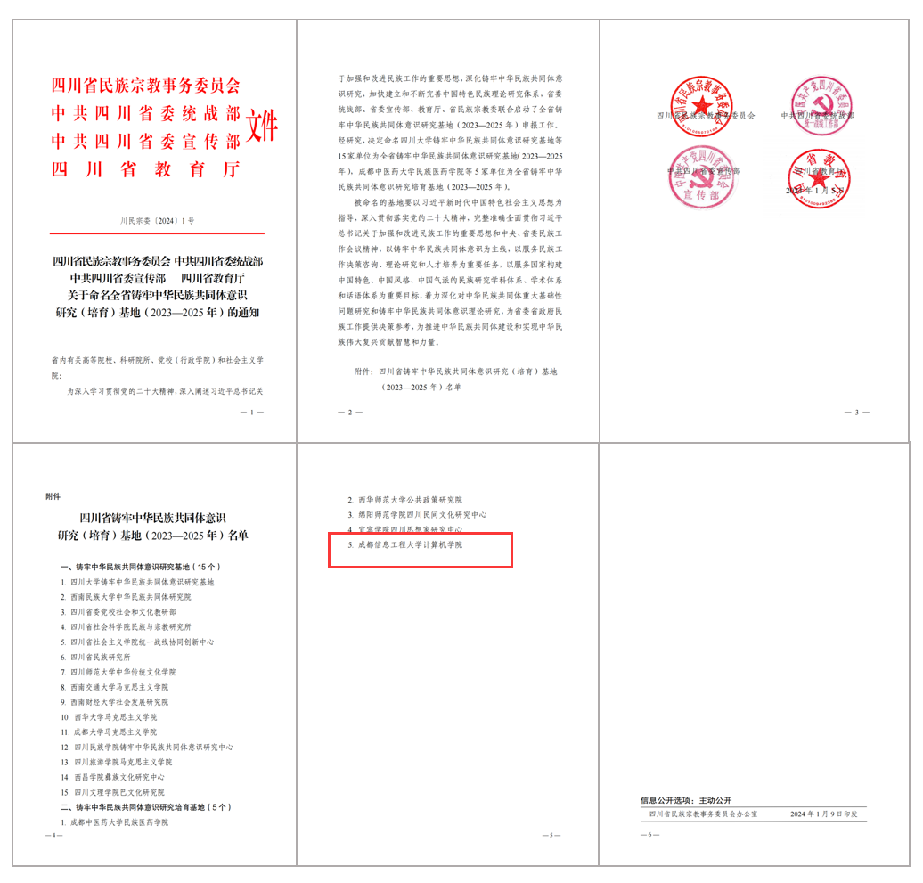 【本网讯】为贯彻落实习近平总书记在中央政治局第九次集体学习时的重要讲话精神,夯实铸牢中华民族共同体意识的理论基础,四川省委统战部、省委宣传部、省教育厅、省民族宗教委日前联合印发《关于命名全省铸牢中华民族共同体意识研究(培育)基地(2023—2025年)的通知》,决定命名全省首批铸牢中华民族共同体意识研究(培育)基地,我校计算机学院被命名为四川省铸牢中华民族共同体意识研究培训基地,位列首批基地之一,是本次被命名单位中唯一一个技术型基地。
