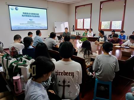 张志华处长表达了作为一位校友回到母校交流的欣喜感慨,他向在座师生们介绍了国家海洋环境预报中心的发展历史、国家发展战略需求等信息,着重详细的介绍了自主研发的风暴潮、海啸等数值预报模式的优点特色,以及其近些年在国内和国际上重大风暴潮、海啸等重大事件中的模拟和检验成效等,还介绍了人工智能预报和未来的研究工作计划。