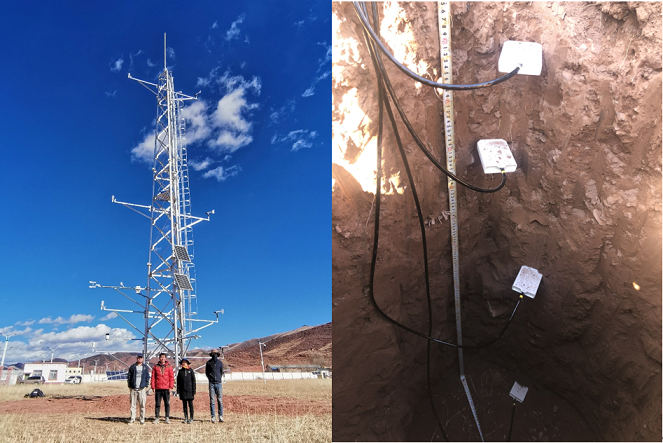 科考小分队在两地观测场中架设了20m高度的大气边界层观测塔,分别进行20m、10m、4m、2m、1m五层的风速、风向、温度和湿度的梯度观测,并且在5m处架设涡动协方差观测系统,2m处增设了红外测温仪观测地表温度,还架设有四分量辐射仪和雨量桶,在土壤中分别埋设了160cm、80cm、40cm、20cm、10cm深度的土壤温湿探头。