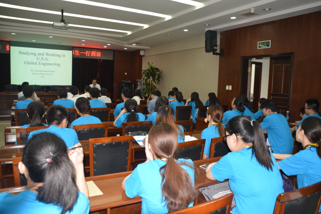 【本网讯】7月14日上午,通信工程学院2017年暑期国际教育周首场讲座在行政楼一会议室顺利举办。来自美国San Jose State University的Sotoudeh Hamedi-Hagh教授给通信工程学院的学生们带来了一场关于“Studying and Working in USA Global Engineering”的专题讲座。通信工程学院院长李英祥,党总支书记刘绍全,副院长马文英、杜江以及六十多名师生参加了讲座。