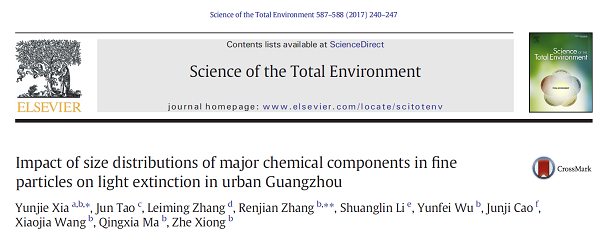【本网讯】近日,大气科学学院研究生夏芸洁以第一作者身份,在国际知名期刊《Science of the Total Environment》上发表了名为“Impact of size distributions of major chemical components in fine particles on light extinction in urbanGuangzhou”的学术论文。中国科学院大气物理研究所研究员张仁健、研究员李双林为共同导师及通讯作者,环球官方为第一署名单位。