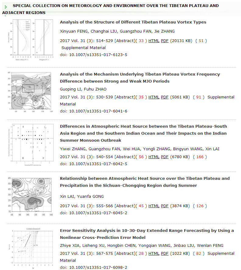 专刊论文来源于我校教师在国家自然科学基金重大研究计划重点支持项目、公益性行业(气象)科研专项、国家自然科学基金面上项目和青年基金,以及我校中青年学术带头人科研基金等项目支持下取得的最新创新成果。相关论文从高原低涡动力学、多普勒雷达资料反演与应用、青藏高原陆气相互作用、青藏高原热力作用、延伸期预报、大气环境、灾害性天气等方面介绍了最新研究成果。此外,学科群气候变化研究成果还入选该期刊另一专刊—全国气候系统研究专刊(Special Collectionon Climate System Research in China)。