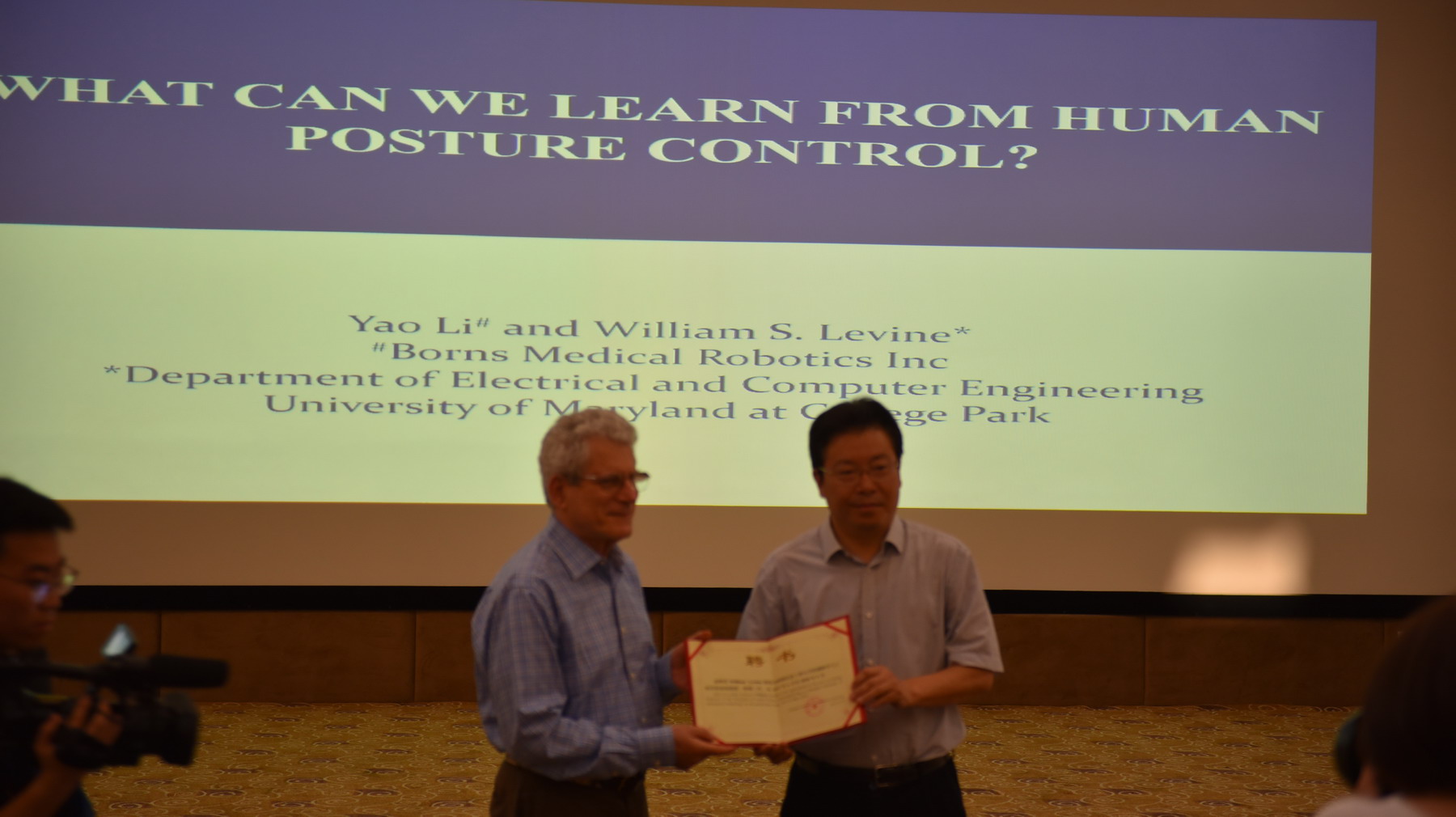 【本网讯】6月8日上午,机器人与智能系统国际联合研究院开展了第八次国际学术交流活动。美国马里兰大学电子计算机工程系终生教授、世界优化控制理论大师、国际IEEE协会终生院士(Life Fellow)、千年奖章(Millennium Medal)获得者William Levine教授受邀在我校国际会议厅为参会师生举办了一场关于“人体姿态控制”的精彩讲座。讲座前,学校党委书记周激流教授为William Levine颁发了控制科学与工程学科客座教授聘书。