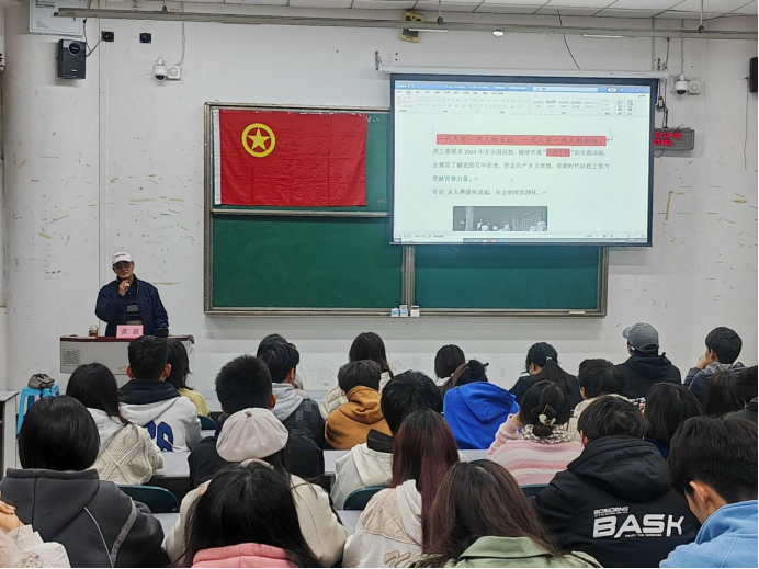 黄波老师首先向同学们讲述了自己作为一名教师、作为关工委成员的责任与担当,分享了自己青年时期求学及在新中国建设中的经历,鼓励同学们要多读书、多读名著,积极参加社会实践,“既多读有字之书,也多读无字之书”。要珍惜大学四年的时光,不仅要学习专业知识,学会独立思考,更要怀揣理想与追求。黄波老师从“五四运动”到新中国成立后支援边疆建设,从“两弹一星”到改革开放,回顾中华民族的历史长征路。通过向学生提问的互动方式,引导同学们深刻了解历史,感受革命前辈为新中国建设谱写的一部部壮丽诗篇,激发强国有我的青春激情。黄波老师希望作为新时代的青年学子,要大胆施展才华,肩负起时代赋予的使命。