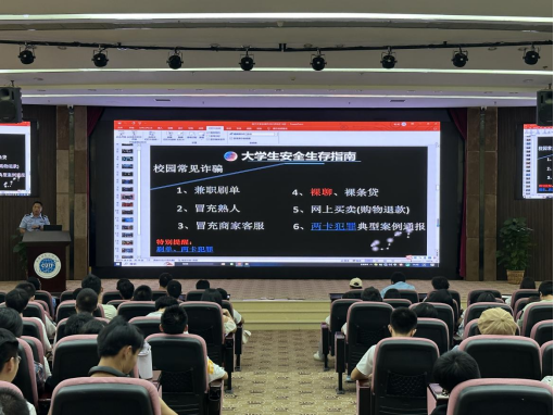 【本网讯】为进一步加强我校学生防范电信网络诈骗的意识和能力,拓展校园安全防范宣传教育覆盖面,切实减少我校电信网络诈骗案件发生,积极营造良好的校园学习生活氛围,9月16日下午,学校党委保卫部、校团委、自动化学院、外国语学院、双流公安分局机场路派出所在我校航空港校区国际会议厅联合组织开展了“大学生安全生存指南”的主题讲座活动,此次讲座由机场路派出所副所长曾阳主讲,学校300余名学生干部及新生代表参加了本次讲座。