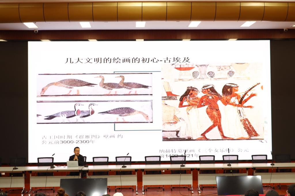 黄老师为同学们展现了《青衣系列》、《群雁图》等一幅幅精美的作品,为同学们带来了视觉冲击和美的享受,也将讲座氛围推向了高潮。