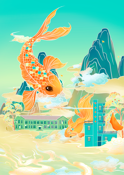 《成信碧源山水图》插画主要以校园代表建筑与山水景观进行结合,体现校园的环境氛围。画面通过学校代表性的钟楼以及图书馆等场景的描绘,体现学校的人文情怀,也展现学校坚持“以人为本,追求卓越”的办学理念,钟楼指针正好指向17:51,代表了建校的1751年。将学校的荷花池及乾坤魂与宋代青瓷碗相结合,体现了中华民族特有的文化精髓和审美情趣。飞行器、飞机、龙泉山脉等一些元素表现了学校大气学科和航空港及龙泉两校区地理位置。整体画面具有一定的视觉效果,展现了优美的校园风采,诠释了优秀的校园文化。